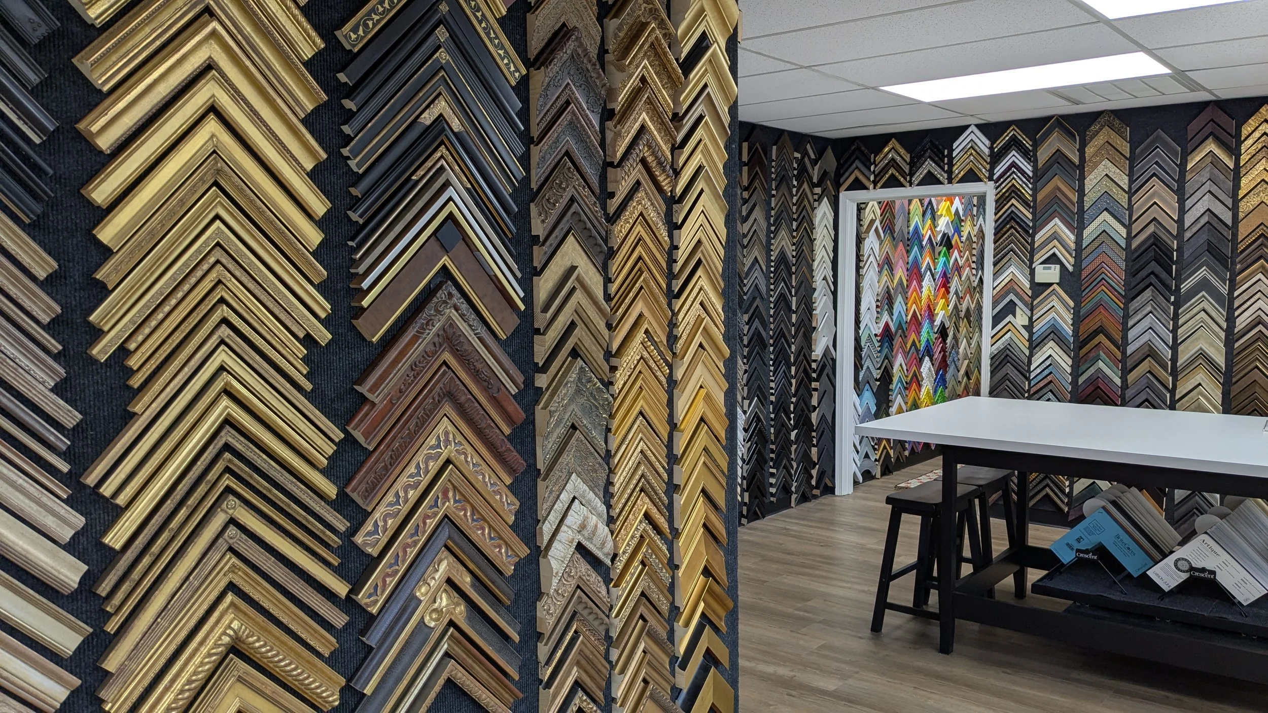 The Frame Shop is your destination for expert picture framing. From custom bespoke projects to full contract installations, our experienced team is trusted by clients and vendors throughout the industry. Browse our extensive showroom — spanning every price point with custom wood and metal mouldings and leading brands like AMCI, Bella, Fotiou, Larson-Juhl, Picture Woods, and Roma. Contact us to make an appointment for your consultation today!